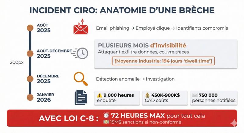 Dans quelques mois, avec l'entrée en vigueur de Loi C-8, votre PME aura 72 heures — pas des mois — pour détecter, évaluer et déclarer une brèche similaire. Sinon? Des sanctions pouvant atteindre 15 millions de dollars.