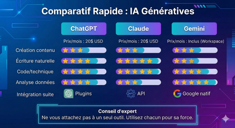 Pour démarrer: ChatGPT Plus (20$/mois). Le plus polyvalent, la plus grande communauté pour apprendre.